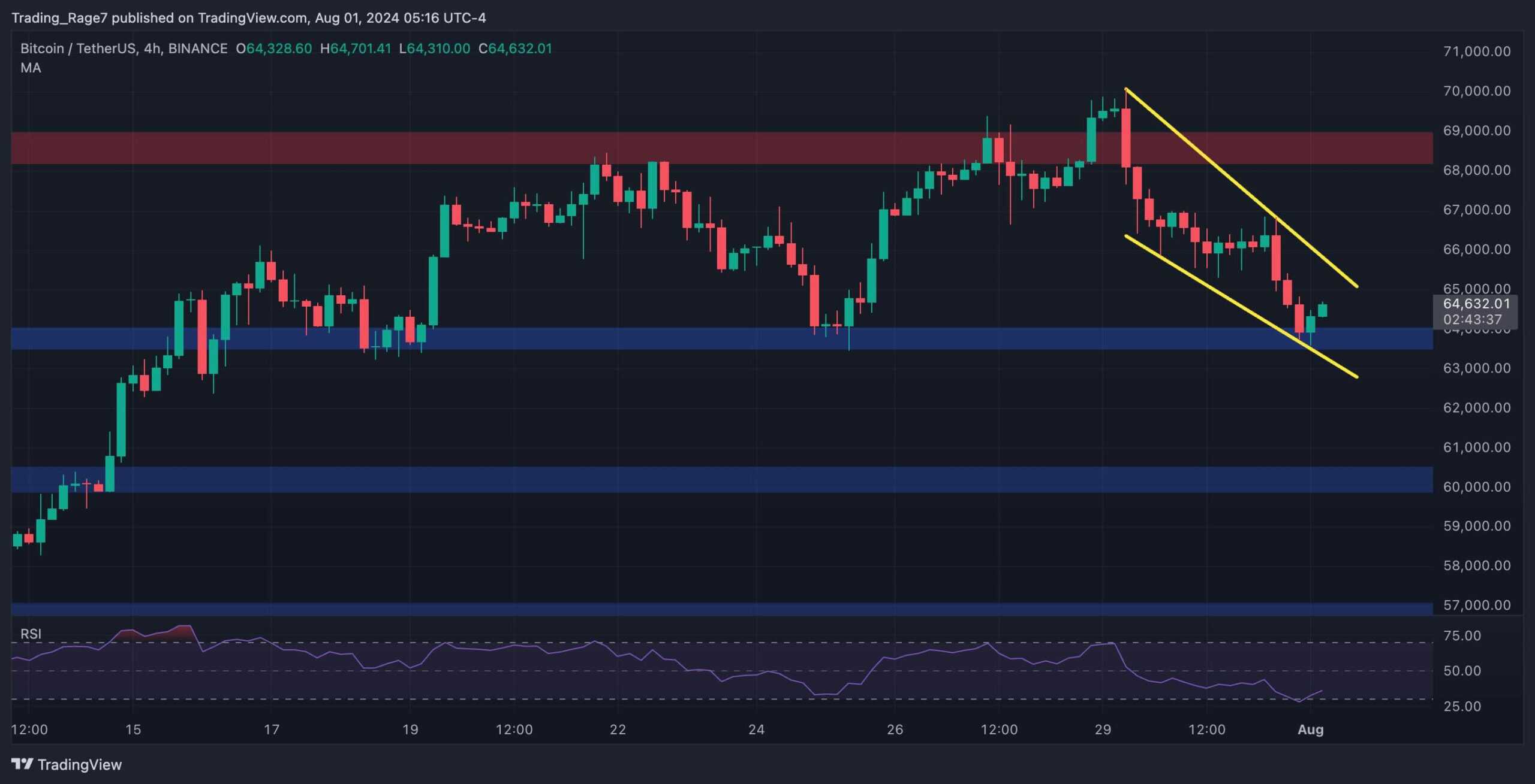 Looking at the 4-hour chart, the price shows a gradual decline in a falling wedge pattern. The cryptocurrency has found support at $64K and the lower boundary of the pattern.