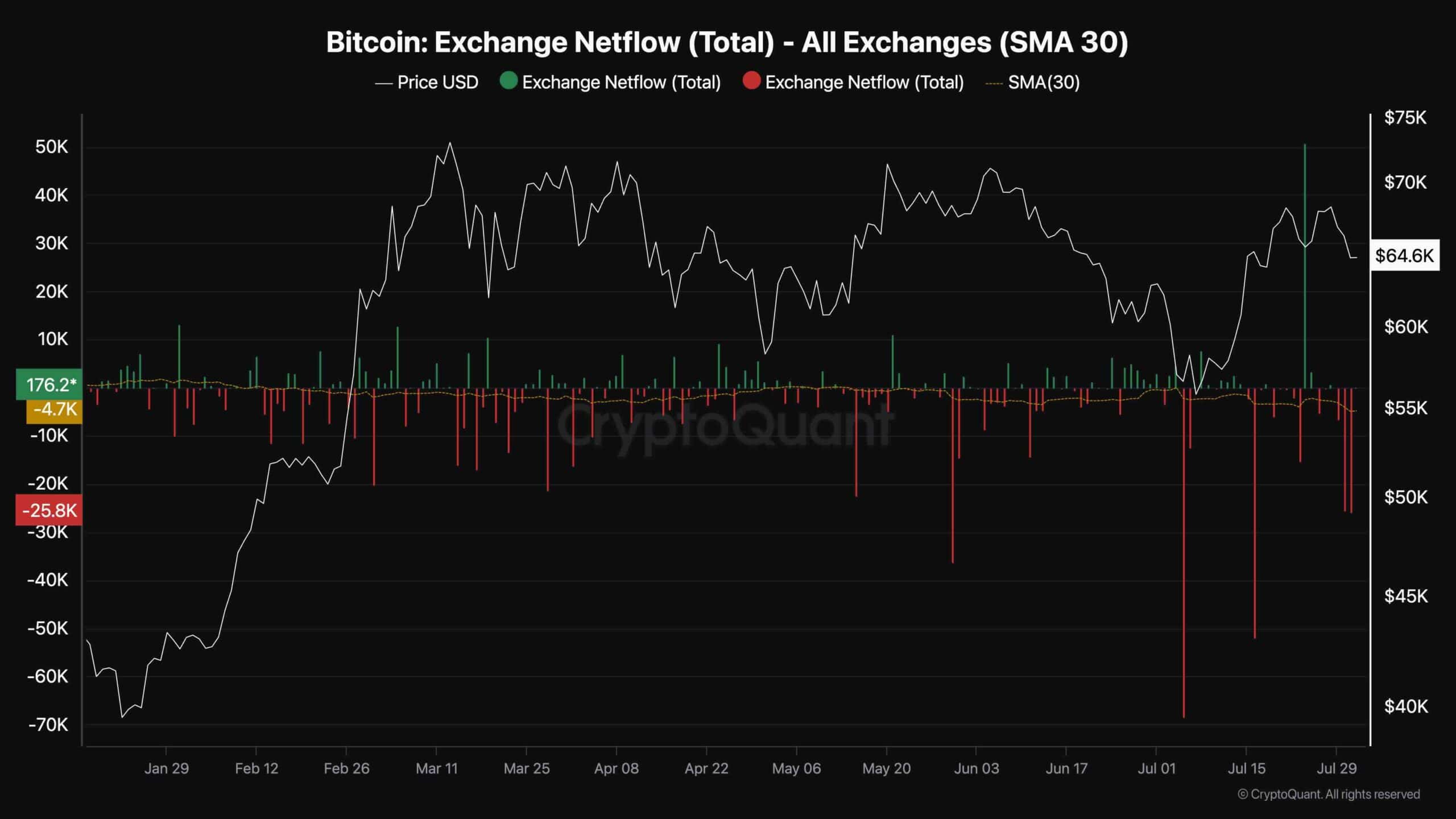 As the chart demonstrates, the BTC Exchange Netflows metric has recently seen two large negative days.