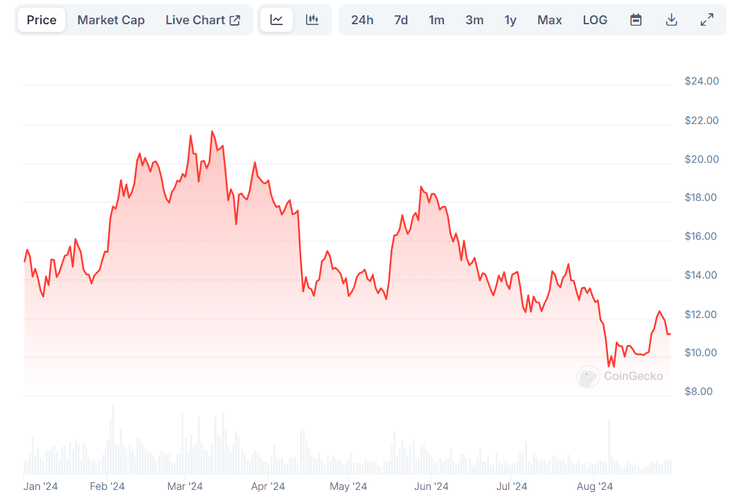However, it has been on a severe downfall in the past few months, currently trading at around $11.20 (per CoinGecko’s data). Its market capitalization stands at approximately $6.8 billion, making it the 18th-biggest in the crypto market.