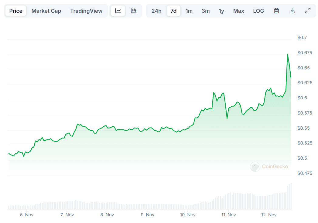 Many leading cryptocurrencies charted fresh daily gains today (November 12), and this time, Ripple’s XRP is among the best performers. Its price is up 9% on a 24-hour scale, briefly surging to an eight-month high of $0.67 and currently trading at approximately $0.64 (per CoinGecko’s data).