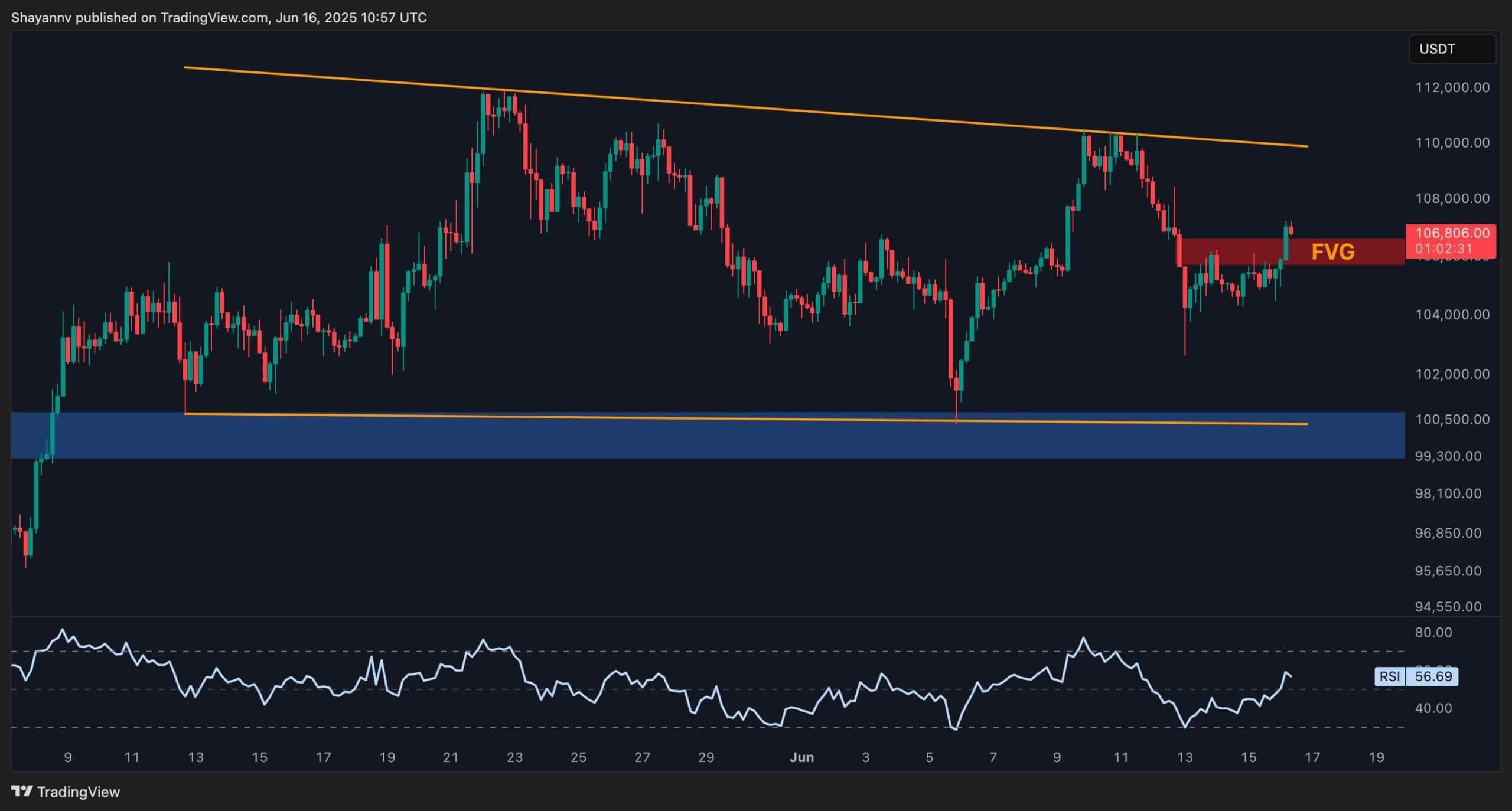 Zooming into the 4H, we can see the asset reacting strongly to the bullish fair value gap at 103K, and bouncing into the bearish FVG around 106K. While this area acts as a clear resistance zone, the price is now breaking it to the upside, which could lead to a bullish leg toward the higher boundary of the large wedge pattern soon. The RSI is also climbing again, currently around 56, which indicates mild bullish momentum but not yet conviction.